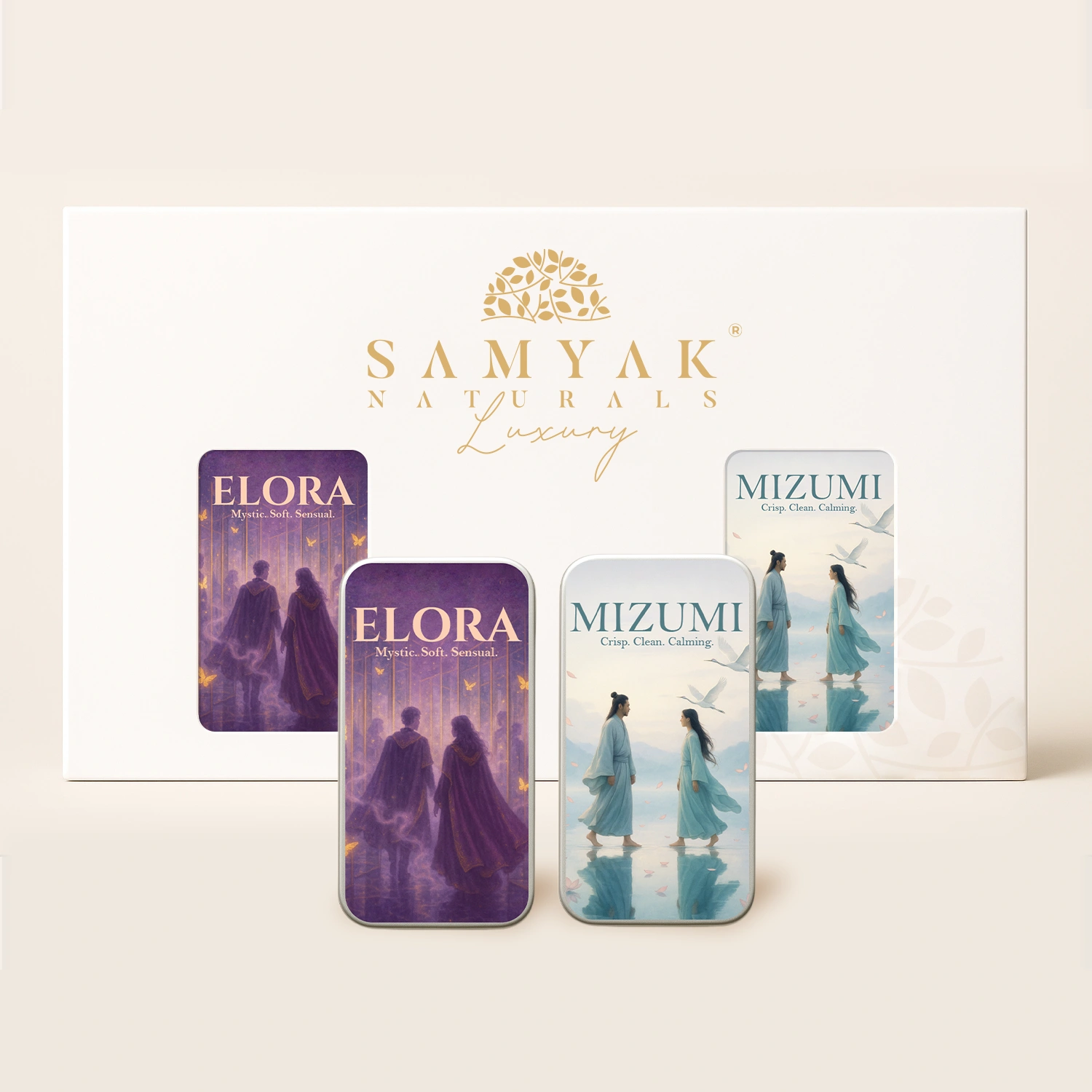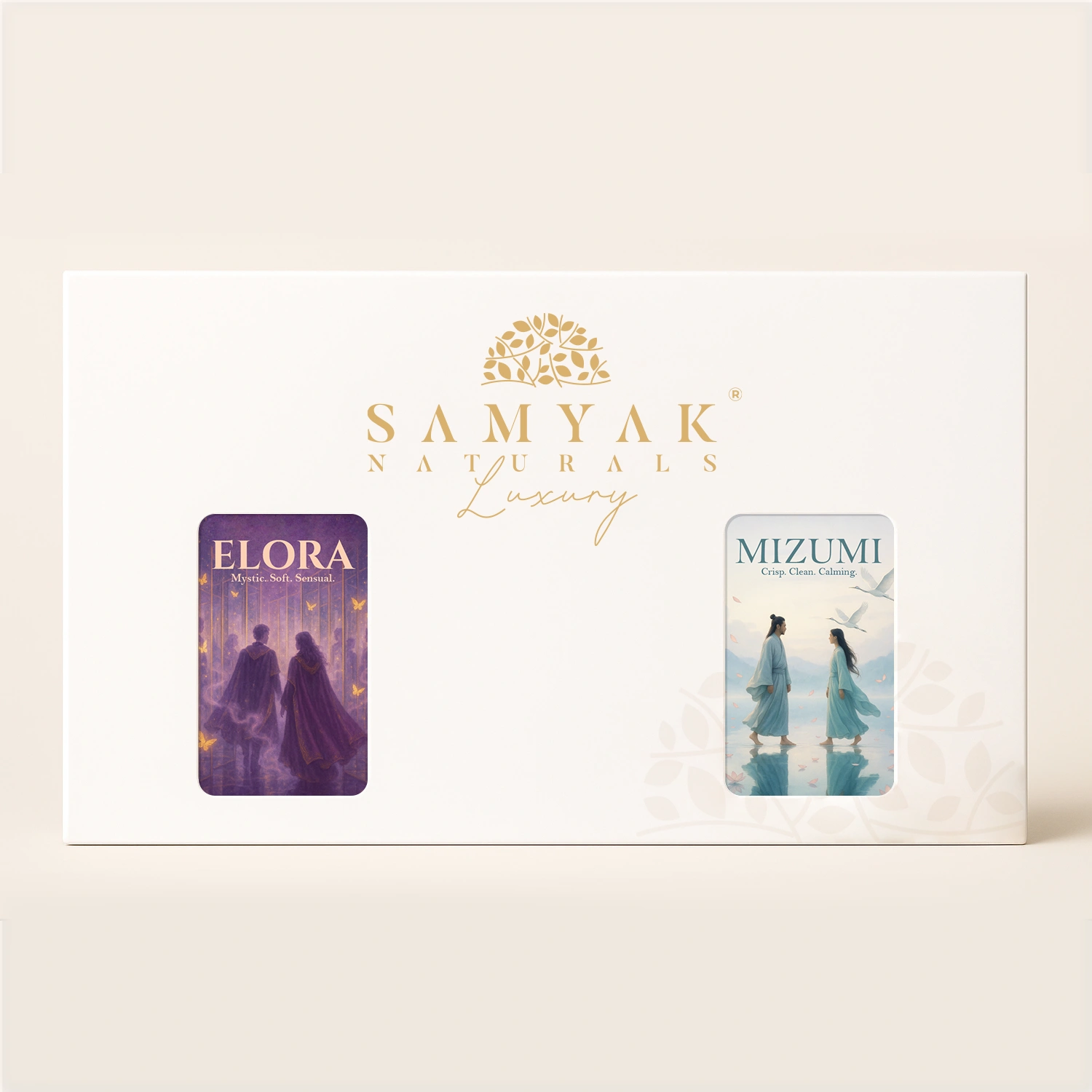 Elora & Mizumi is a fragrance duo designed for men who seek both grounded strength and refreshing clarity. Elora’s musky base carries traditional masculine charm, while Mizumi shines with citrus, lotus, and vetiver. This set offers versatility and balance — a pairing for office hours, evening confidence, and weekend adventures.